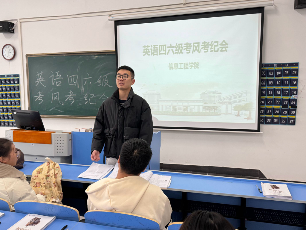为强化学生诚信考试意识,规范四六级考试秩序,引导学生以端正态度备战考试,信息工程学院辅导员薛楚雄在教学楼3403教室召开四六级考风考纪主题班会。计科2303、软工2401、电信2401班级全体学生参会。
