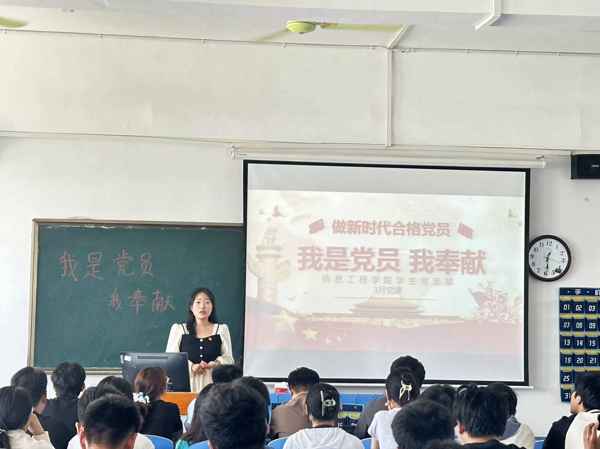 本网讯(记者/通讯员 陈雪)信息工程学院党总支于3月22日在6505教室组织开展了“我是党员,我奉献”主题党课活动,我院全体教师及在校学生党员参加了本次学习活动。