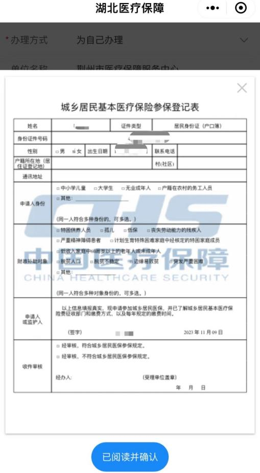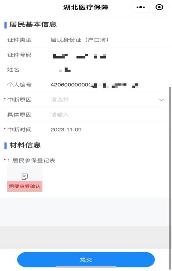 2、填写信息,选择需要办理暂停的参保地(户籍地-老家)后,填写中断原因,然后点击“居民参保登记表”;核对个人信息后,点击已阅读并确认。