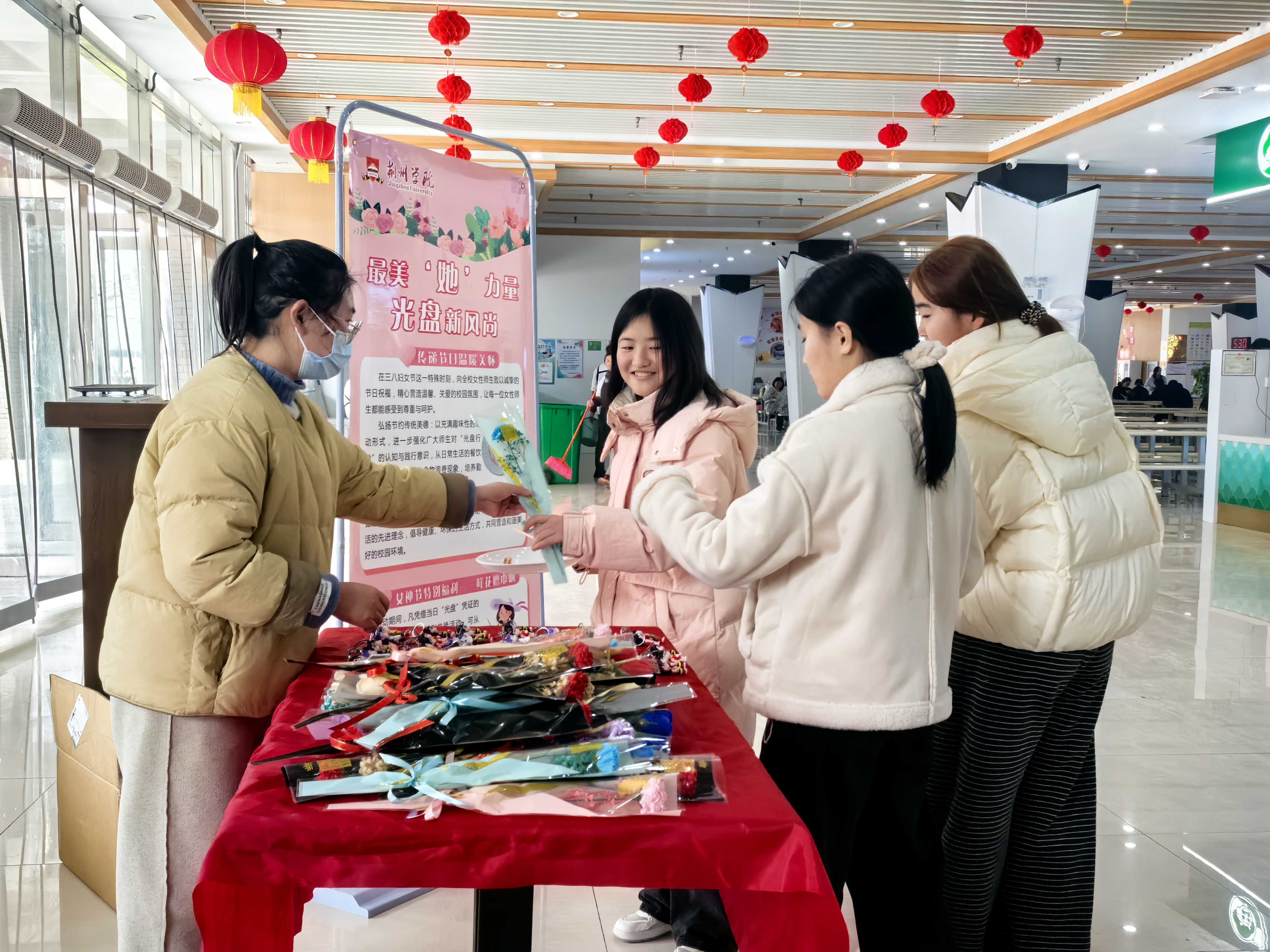 活动现场节日氛围浓厚,温馨而热闹。膳食服务中心特别为参与“光盘行动”的女神们准备了精美的鲜花和可爱的玩偶作为节日礼物。每一位践行“光盘”的女神在用餐结束后,均可凭“光盘”领取鲜花或玩偶一份,以此鼓励大家珍惜粮食、杜绝浪费。活动吸引了众多师生积极参与,大家纷纷表示,这样的活动既有趣又有意义,既感受到了节日的温暖,又增强了节约意识。