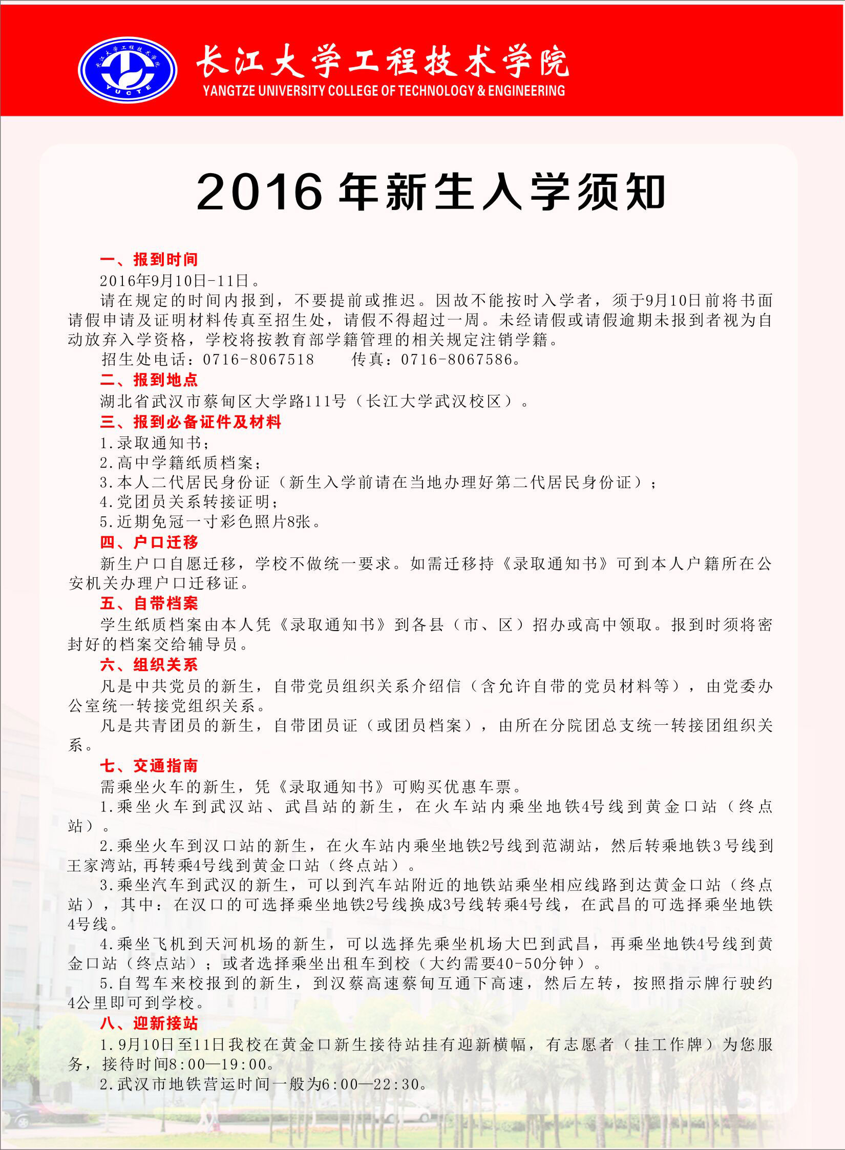 长江大学工程技术学院2016年新生入学须知