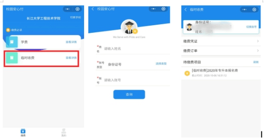 点击“临时收费”菜单的“查看详情”依次填入:姓名、账号类型(请选择“身份证号”)、输入身份证号点击查询即可看到待缴项目。
